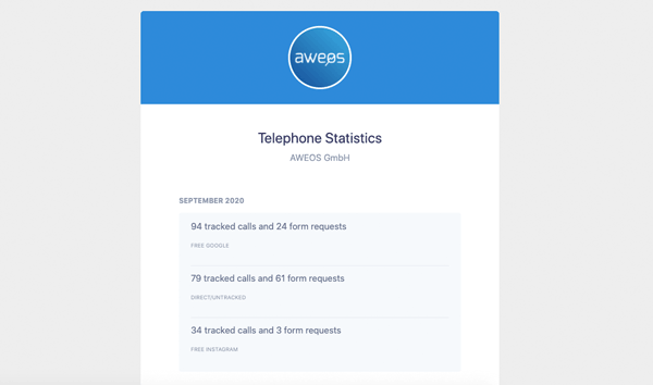 Sie erhalten regelmäßig eine E-Mail mit den Auswertungen. Diese beinhaltet neben den getrackten Anrufen auch eine Auswertung über eingegangene Anfragen über das Kontaktformular (Contact Form 7 / Wordpress).