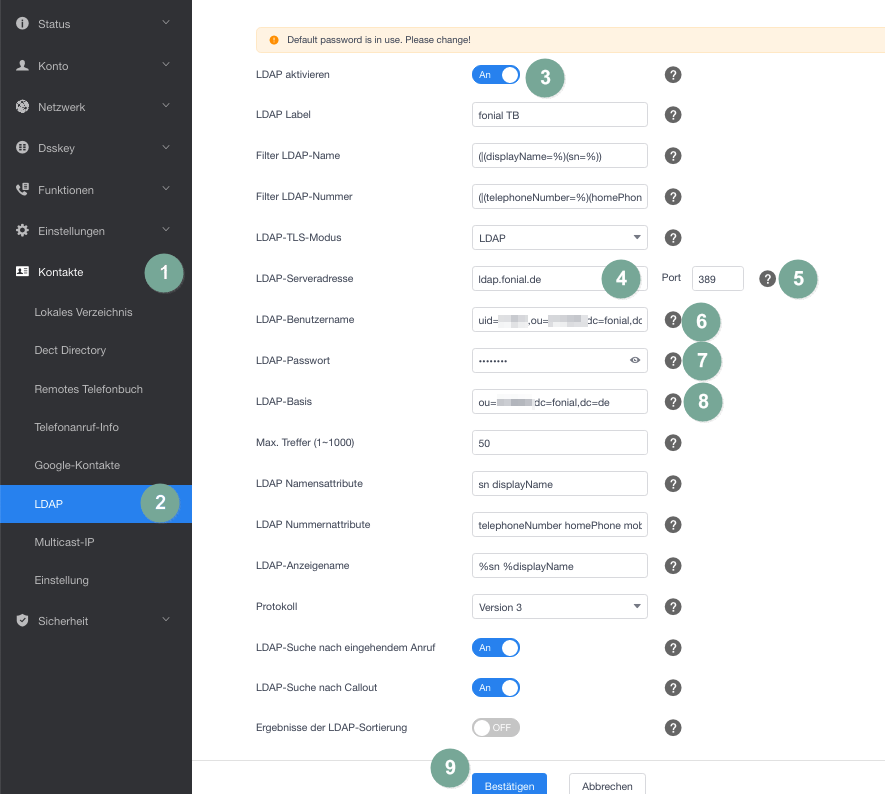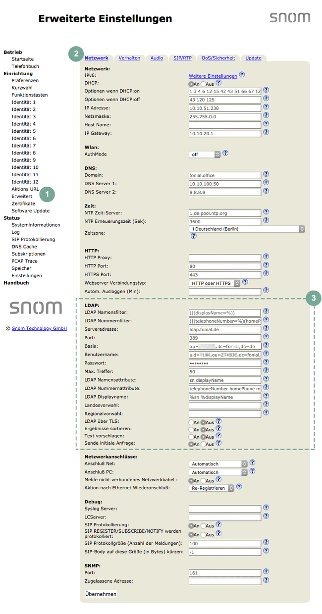 Nun müssen Sie die LDAP-Zugangsdaten im Telefon eintragen.