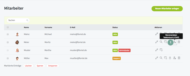 Um das Telefonbuch zu nutzen, aktivieren Sie es in den Einstellungen des entsprechenden Mitarbeiters. Bitte beachten Sie, dass diesem ein Endgerät zugeordnet werden muss, damit LDAP genutzt werden kann. Die Rechte an einem Ziel sind exklusiv. Das heißt, dass nur ein Mitarbeiter das entsprechende Telefon nutzen kann.