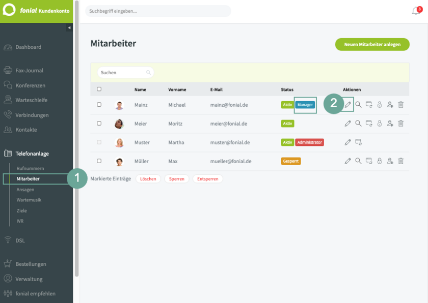 Das fonial-Manager-Konto gibt Ihnen die Möglichkeit, einen oder mehrere beliebige Mitarbeiter mit erweiterten Rechten auszustatten. So können Sie neben dem eigentlichen Administrator-Konto, welches alle Berechtigungen besitzt, technische Administratoren für die Konfiguration und das Management der Cloud-Telefonanlage benennen. Damit können auch weitere qualifizierte Mitarbeiter die Einrichtung von Zielen, Rufummern etc. übernehmen.