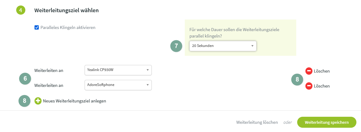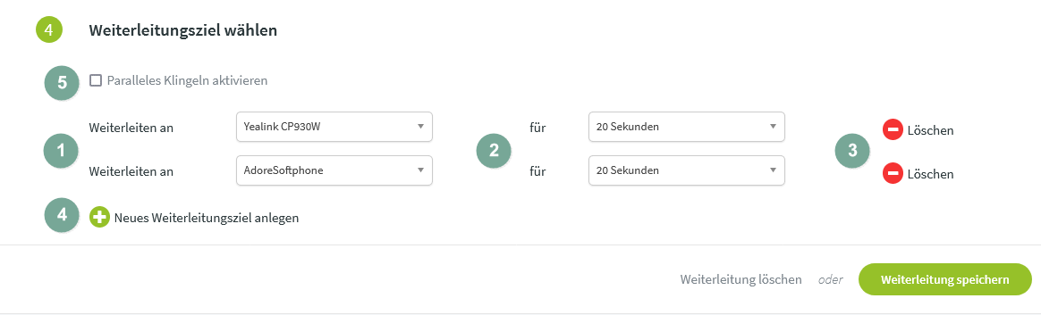 Jeder Rufnummer muss mindestens ein Weiterleitungsziel zugeordnet werden. Nur so kann ein Anruf durchgestellt werden. Ein Weiterleitungsziel kann beispielsweise das von Ihnen eingerichtete IP-Tischtelefon sein. Möchten Sie, dass das IP-Tischtelefon unter einer bestimmten Sprachrufnummer erreichbar ist, müssen Sie die Sprachrufnummer dem entsprechenden IP-Tischtelefon zuordnen.