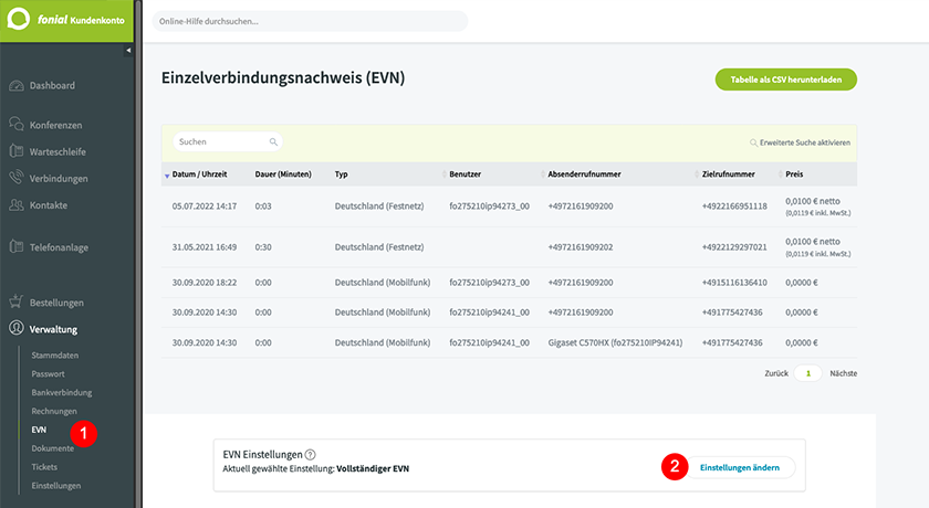 Der Einzelverbindungsnachweis (EVN) ist eine detaillierte Übersicht Ihrer ausgehende Anrufe ergänzend zu Ihrer Rechnung. Hier werden alle ausgehenden Gespräche mit ausgehender und angerufener Rufnummer, Datum und Uhrzeit des Anrufs sowie der entsprechenden Kosten aufgelistet. Sie erhalten monatlich eine Übersicht Ihrer getätigten Verbindungen in Ihrem Kundenkonto. Der EVN ist im fonial Kundenkonto unter "Verwaltung" - "EVN" einsehbar und kann im Bereich "Rechnungen" als CSV-Datei heruntergeladen werden. Sie können dieses mit einem Tabellenkalkulationsprogramm, wie beispielsweise Microsoft Excel, öffnen und einsehen.