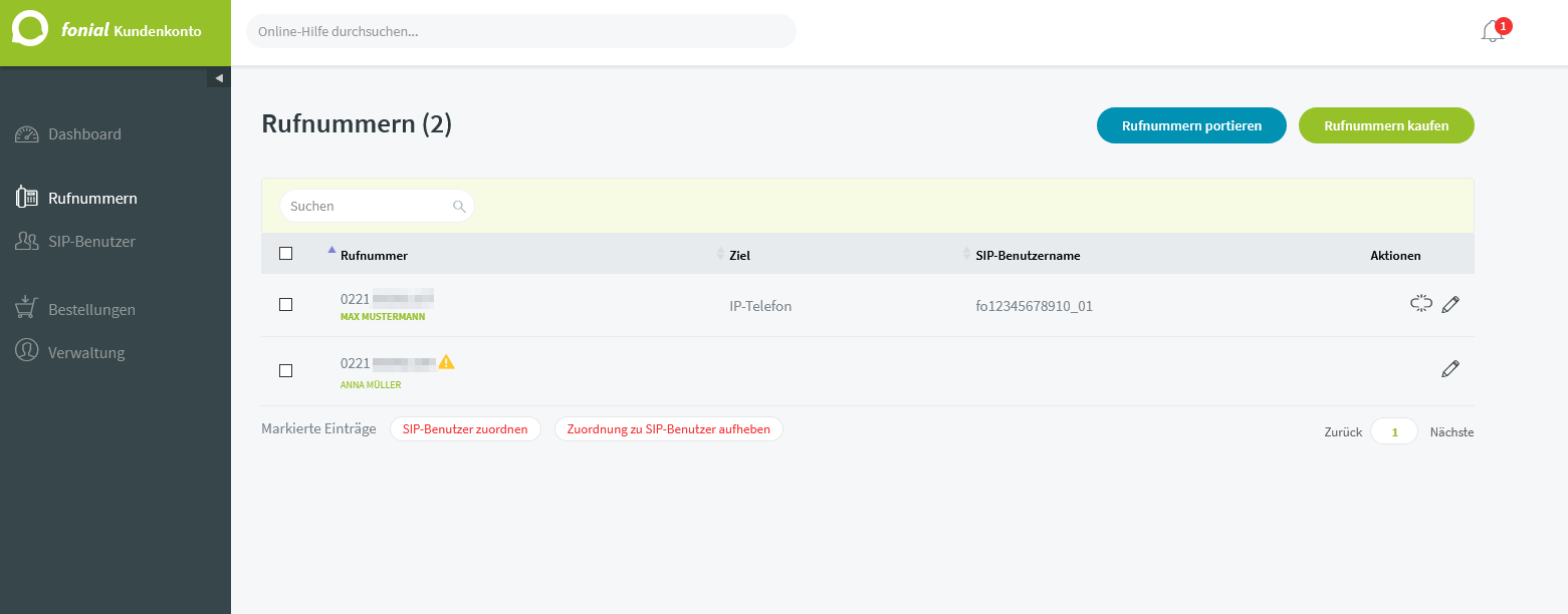 Im Menüpunkt "Rufnummern" finden Sie eine Übersicht aller in Ihrem Kundenkonto befindlichen Rufnummern. Über das Stift-Symbol können Sie Ihre Rufnummern mit einem SIP-Benutzer verknüpfen. Mit dem Aufhebungs-Symbol können Sie die Verknüpfung zu einem SIP-Benutzer aufheben. Achten Sie darauf die SIP-Benutzer und auch die Ziele sinnvoll zu benennen, um sie auseinander halten zu können. Gerade wenn Ihr Unternehmen mehrere Standorte in Deutschland hat, und diese auch über ein Kundenkonto verwaltet werden, dient das einer guten Übersicht. Ist hinter einer Rufnummer ein gelbes Warndreieck zu sehen, bedeutet das, dass noch kein Ziel für die jeweilige Rufnummer angelegt wurde. Unter "Ziele" können Sie einsehen, mit welchem Gerät eine Rufnummer verbunden ist. Alle Einstellungen können jederzeit bearbeitet werden und treten nach der Änderung sofort in Kraft.